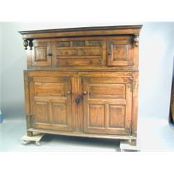 An early 18th Century oak Duodarn, the upper section with a cupboard at each side with drawers in the centre, one long with five smaller drawers the lower section with two cupboards with panelled doors 174cm wide x 167cm high x 59cm deep