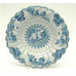 An early 18th century Dutch tin-glazed earthenware dish, with lobed rim, reeded border and raised central boss, painted with seated Oriental figures and landscape in blue (cracked) 13.5ins £80-120