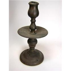 An early 18th century brass candlestick, the thistle shaped nozzle on a baluster stem above the bro.