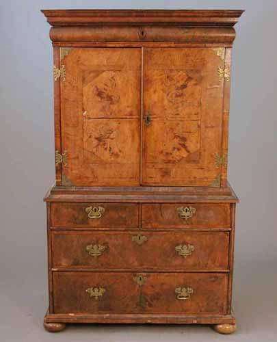 An early 18th century walnut cabinet on chest, fitted with a frieze drawer over a pair of doors enclosing pigeon holes, central cupboard and further drawers with writing slide over two short and two long drawers on bun feet, 3ft 1ins £3,500-4,500