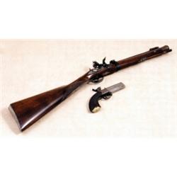 An early 19th Century flintlock blunderbuss, half octagonal damascus barrel leading to the bell mouth, surmounted by a trefoil sprung bayonet, the lock edge engraved and "Griffin", makers mark, rain proof pan, swan neck cock, steel furniture, the trigger guard foliage engraved with "104" in panel, walnut stock with chequered wrist and white metal escutcheons, finish remaining on barrel, lock re-finished with some pitting, overall length 76.5cm 30 inches. See Illustration £300-375