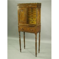 An early 19th Century narrow oak cabinet, with a three quarter gallery over a pair of gothic panelled doors enclosing two columns of seven graduated drawers with satinwood veneered fronts, and two frieze drawers, the lower section with a drawer, on turned legs, 61cm wide x 152cm high
