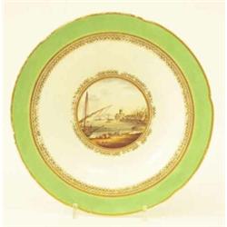 An early 19th century Derby dessert plate, painted with a view of The Harbour of Leghorn, named verse, against a gilded apple-green border, 10.5ins £150-200