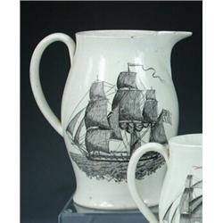 An early 19th century Liverpool creamware jug printed in black on one bellied side with an oval scene of a lady waving goodbye to a distant ship below a banner inscribed 'Returning Hopes' and above a verse, the reverse with a three masted warship, 18cm high. For an illustration of a plate printed with 'Returning Hopes' see Alan Smith 'Liverpool Herculaneum Pottery' plate 42 £350-500
