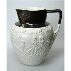 An early 19th century Minton stoneware jug moulded in Turner's style with huntsmen resting at the end of the day and dividing the bag, below a chocolate glazed rim band, applied seal mark, 21cm high £100-150