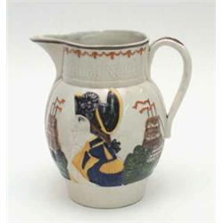 An early 19th century Prattware Commemorative jug moulded in relief with named profile portraits of Admiral Nelson and Captain Berry, flanked each side with frigates in full sail 6ins. high (minor chip to spout rim) £600-900