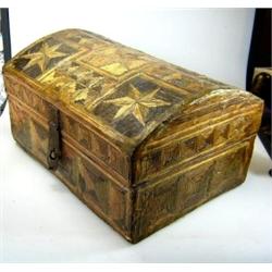 An early 19th century Prisoner of War straw work casket, the arched lid worked with five stars and..