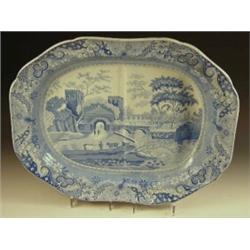 An early 19th century Spode blue and white platter printed in blue with the gate of Sebastian at Capena or the castle pattern, the gravy reservoir at one end, impressed mark, 52.5cm wide. Leonard Whiter in 'Spode' page 168 says that this design was taken from Merigot's 'Views of Rome and its Vicinities' published 1796-8 £250-350