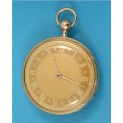 An early 19th century Swiss gold quarter repeating pocket watch, the engine turned case with push pendant repeat action, the engine turned gilt dial with matted Roman chapter ring and gold hands, movement with bridge cock, unsigned £400-600