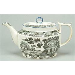 An early 19th century black-printed pearlware teapot and cover, of oval shape with "D" handle and cover with simple loop knop, with blue lining to the rim, spout and knop, printed on either side with a chinoiserie scene featuring an ornate pagoda and a prominent "apple" tree, and with a border of geometric panels and scrolls around the shoulder and cover, overall length 27cm, unmarked, circa 1800-10 (some minor chipping and glaze flaking)