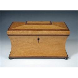 An early 19th century burr maple tea caddy, the waisted sides of the sarcophagus shape with ring handles, the lid closing on fillets of rosewood, the interior with two canisters and cut glass mixing bowl, 32cm wide £400-600