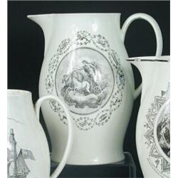 An early 19th century creamware jug printed in black on one side with Apollo riding his chariot of..