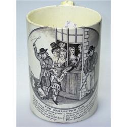 An early 19th century creamware mug printed in black with an oval scene of the wealthy passing money through an open window to a performing dog troop, the title 'The Neglected Tar' and verse below in support of the seaman looking on to the scene, 12cm high £300-400