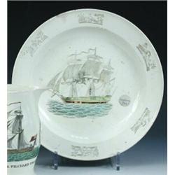 An early 19th century creamware plate printed and overpainted with a three masted ship flying the Ha