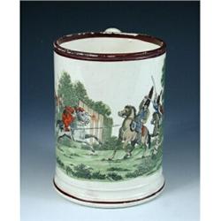 An early 19th century creamware quart mug printed and painted with a cavalry skirmish, bearded lance