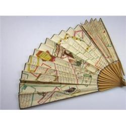 An early 19th century fan, the paper leaf printed and hand coloured with mottoes, riddles, music and thought provoking curios, the sticks of wood 20cm long £60-80