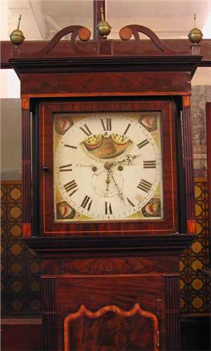 An early 19th century inlaid mahogany eight day longcase clock with broken arch pediment above square white enamel dial signed by Nathaniel Dumville of Stockport 1000-1200