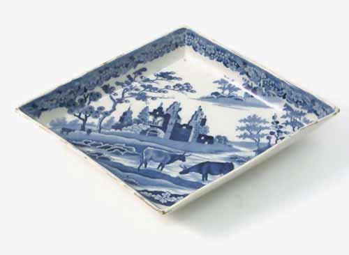 An early 19th century lozenge-shaped dessert dish, printed with oxen at a river and background ancient ruins, cracked, 11.25in. long £50-70
