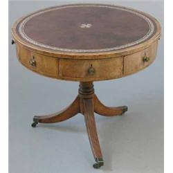 An early 19th century mahogany drum table, with later leathered top, four real and four dummy dra...