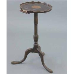An early 19th century mahogany urn table, with circular galleried top with central medallion and two slides on turned beech stem and tripod, 1ft 1ins £80-120