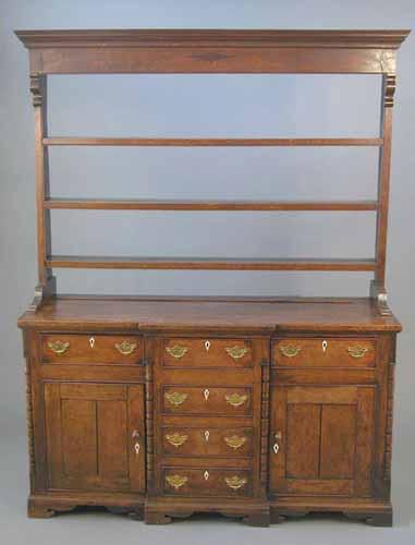 An early 19th century oak breakfront dresser, with triple shelf back over three real and three du...