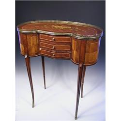 An early 20th Century French kidney shaped side table with a pierced brass gallery and inlaid floral and ribbon decoration above three short drawers on four slender legs, 69cm high, 59cm wide