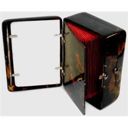 An early 20th century card and note case, the rounded rectangular body opening on two clasps to spread out in a concertina the red silk card compartments, an ivory notepad and pencil inside one lid, 10.5cm wide £50-80