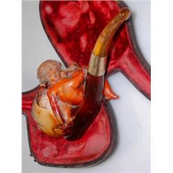 An early 20th century meerschaum pipe, the bowl carved with an amorini holding two cherries while a bee creeps around the bowl towards them, the reconstituted amber mouthpiece with gilt metal band, 16cm long, with leather case £120-150