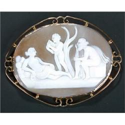 An early 20th century rose gold and shell cameo oval brooch, depicting a classical scene with Ven...