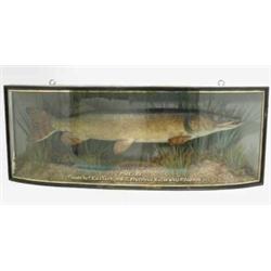 An early 20th century taxidermic pike, inscribed bow fronted case with naturalistic river bed set...
