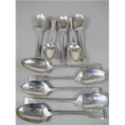 An early George III rat tail silver table spoon, hallmarked Edinburgh 1763, maker Lothian and Robertson, a George II silver table spoon, London 1757, maker W.M.Shaw & W.M. Priest, a George III table spoon, London circa 1760's, maker John Lamfert and two other early George III silver table spoons Est. 50/80