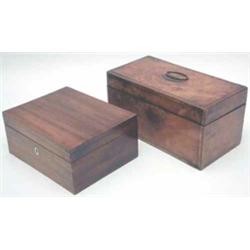 An early Victorian cross-banded mahogany tea caddy, 12ins (attention needed) and a Victorian mahogany work box, 9.5ins (tray missing) £70-100