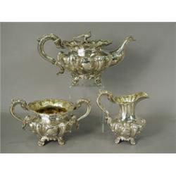 An early Victorian silver teaset, comprising a teapot, milk jug and twin handed sugar bowl, of sq...