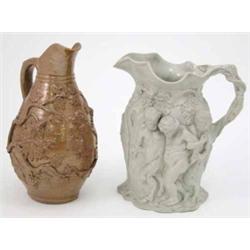An early Victorian stoneware Bacchus jug, moulded with figures and grape vines in bold relief, 9ins and a Victorian salt-glazed stoneware jug moulded with figures and fruiting vines, 10ins £70-100