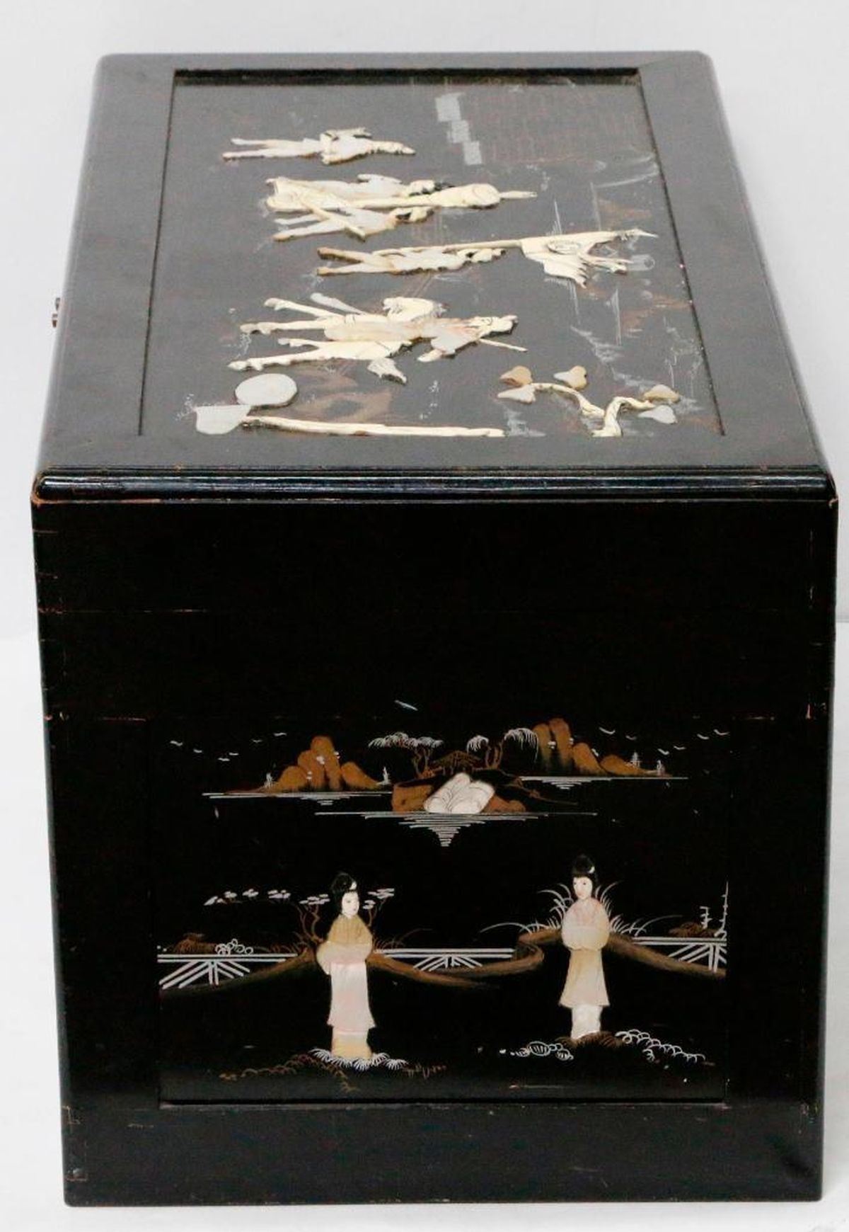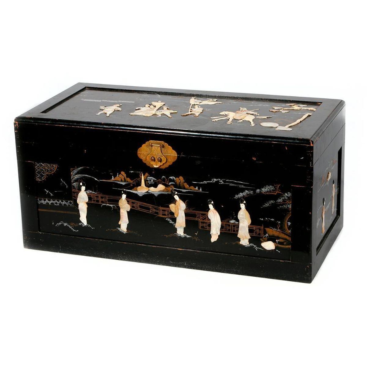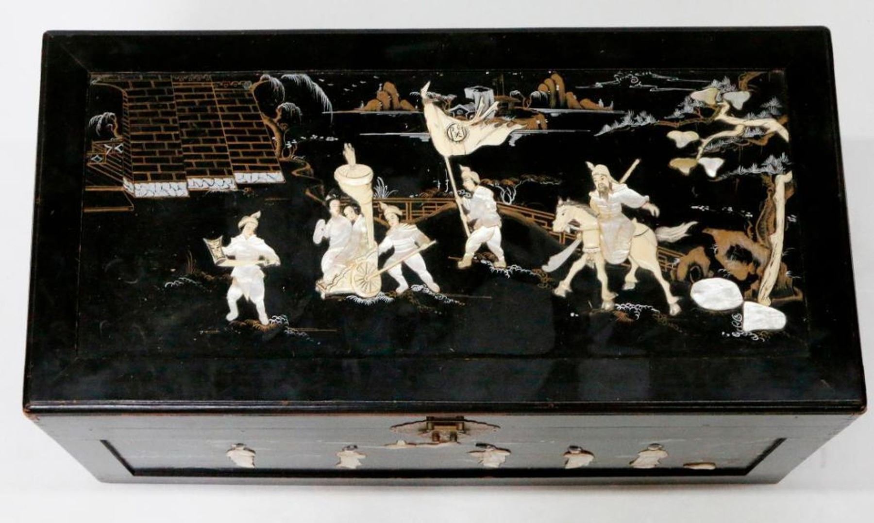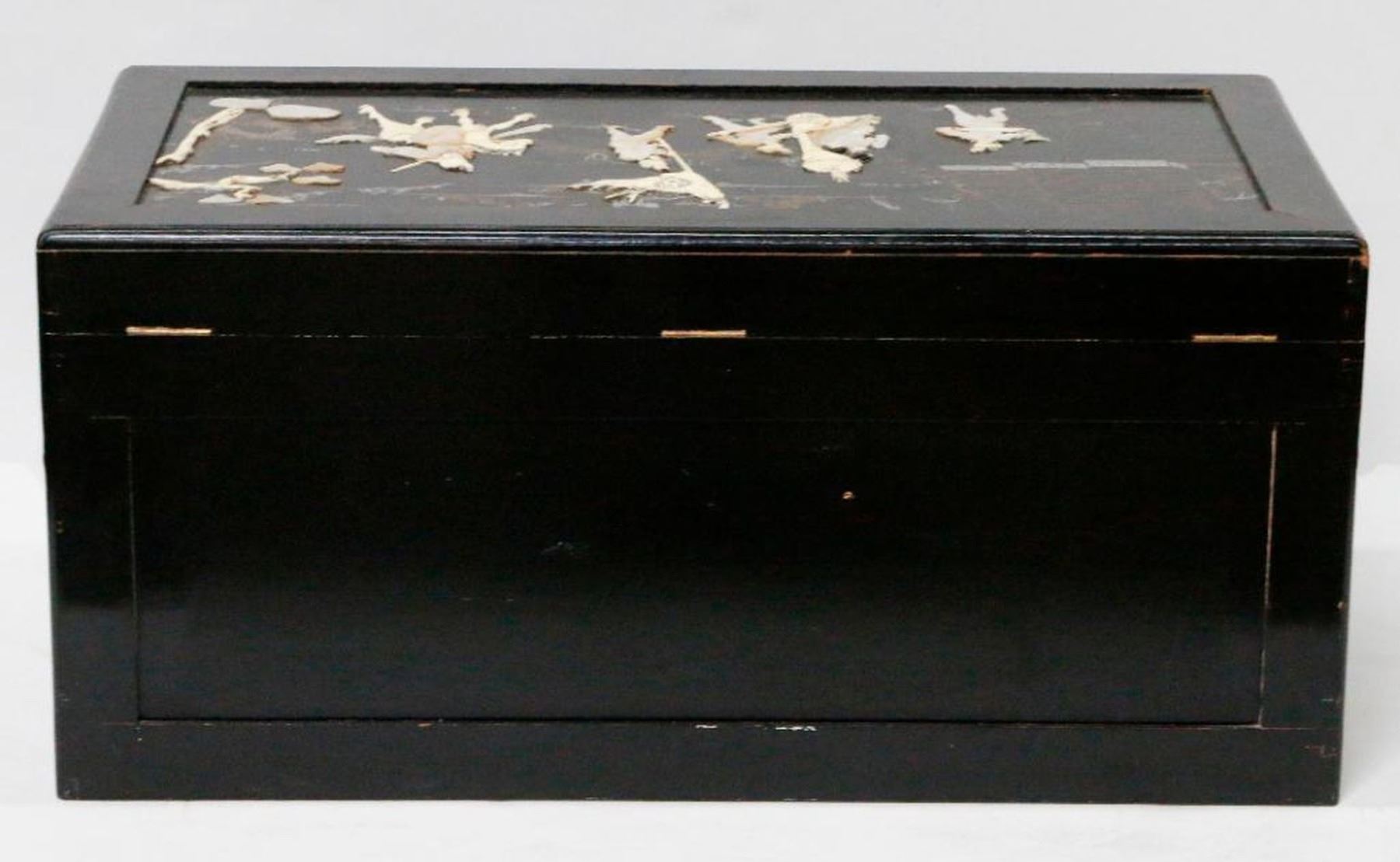 An ebonized and painted Chinese chest with mother of pearl and bone inlays measuring 19 inches high x 40 1/2 wide x 20 deep.