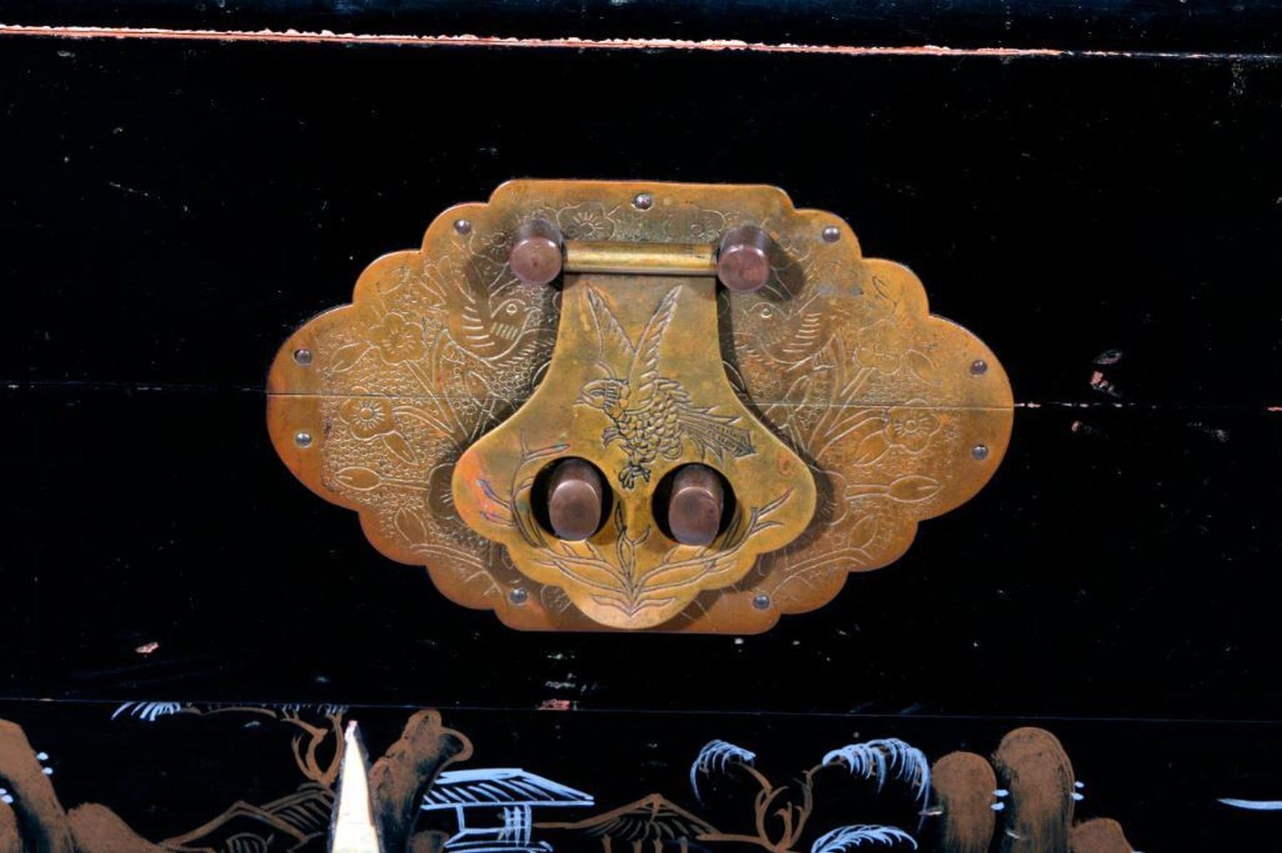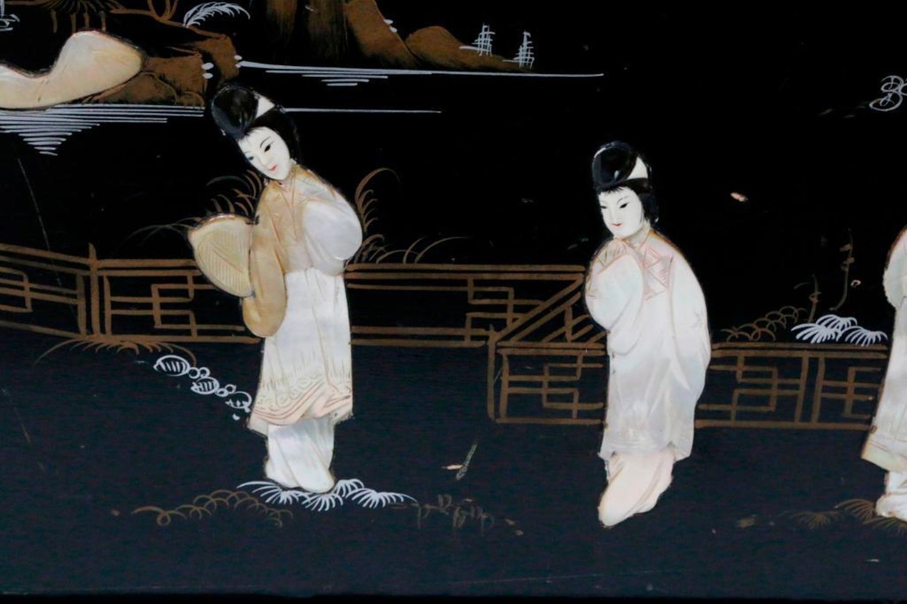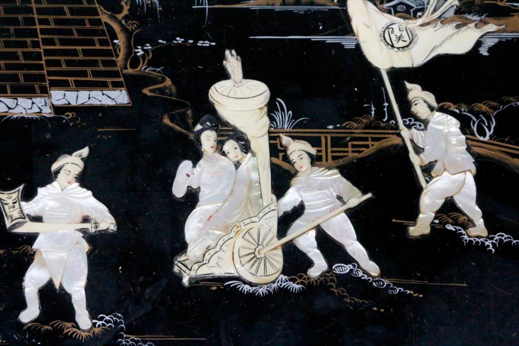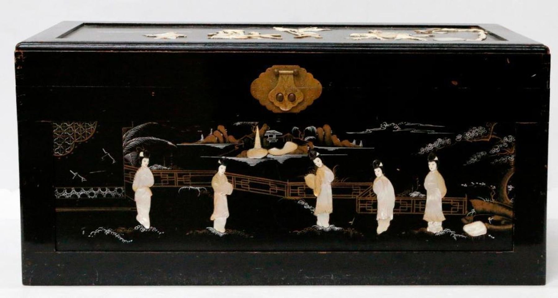 An ebonized and painted Chinese chest with mother of pearl and bone inlays measuring 19 inches high x 40 1/2 wide x 20 deep.