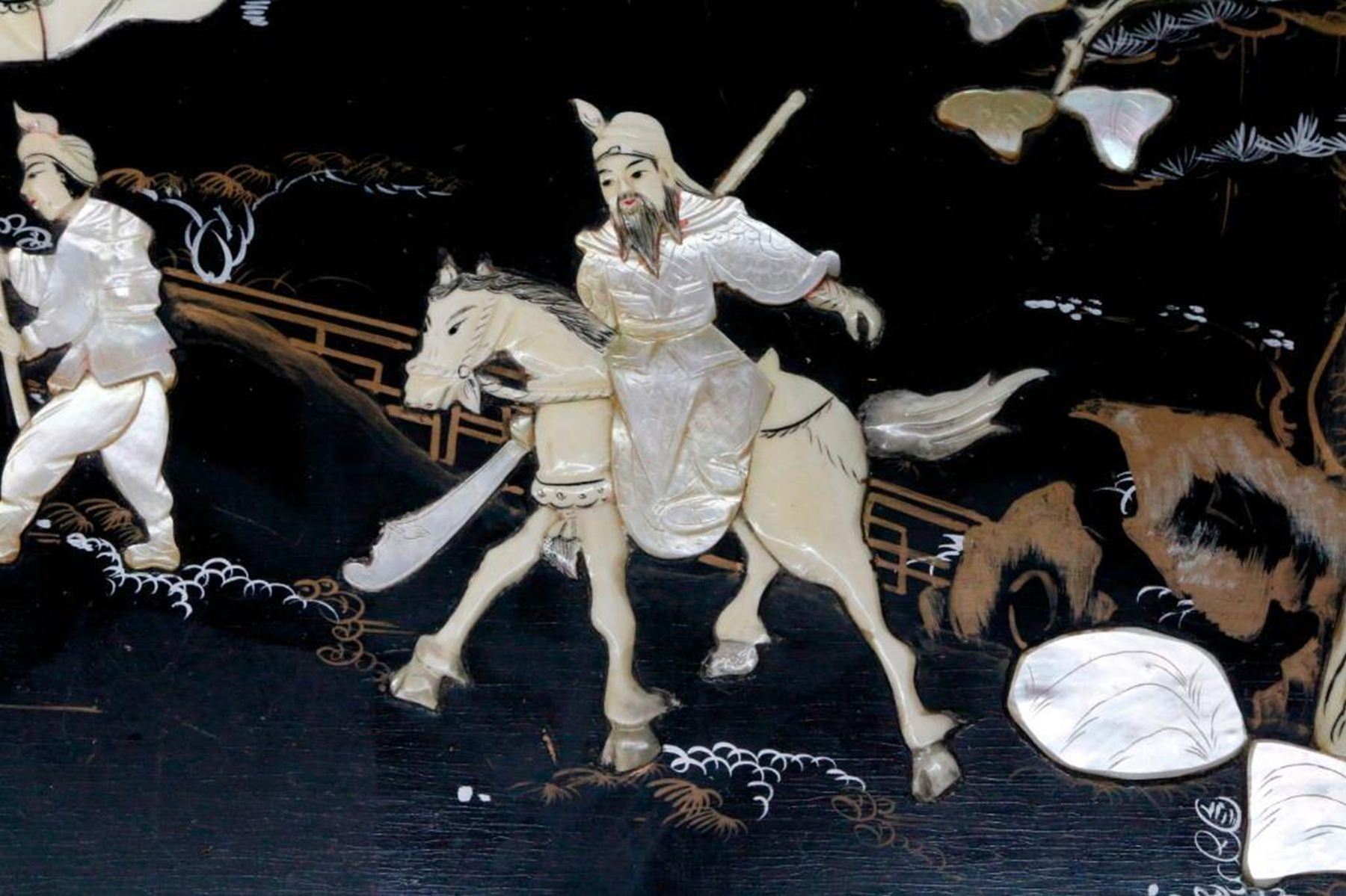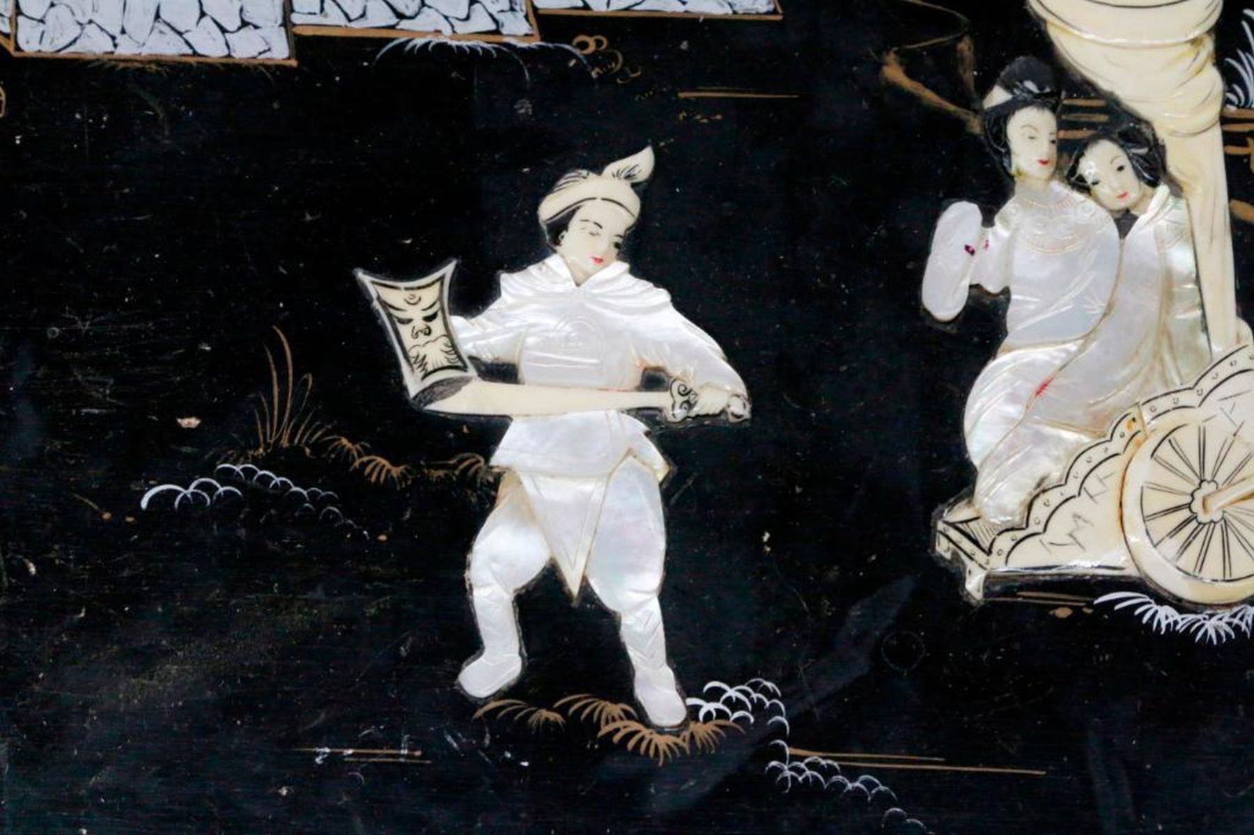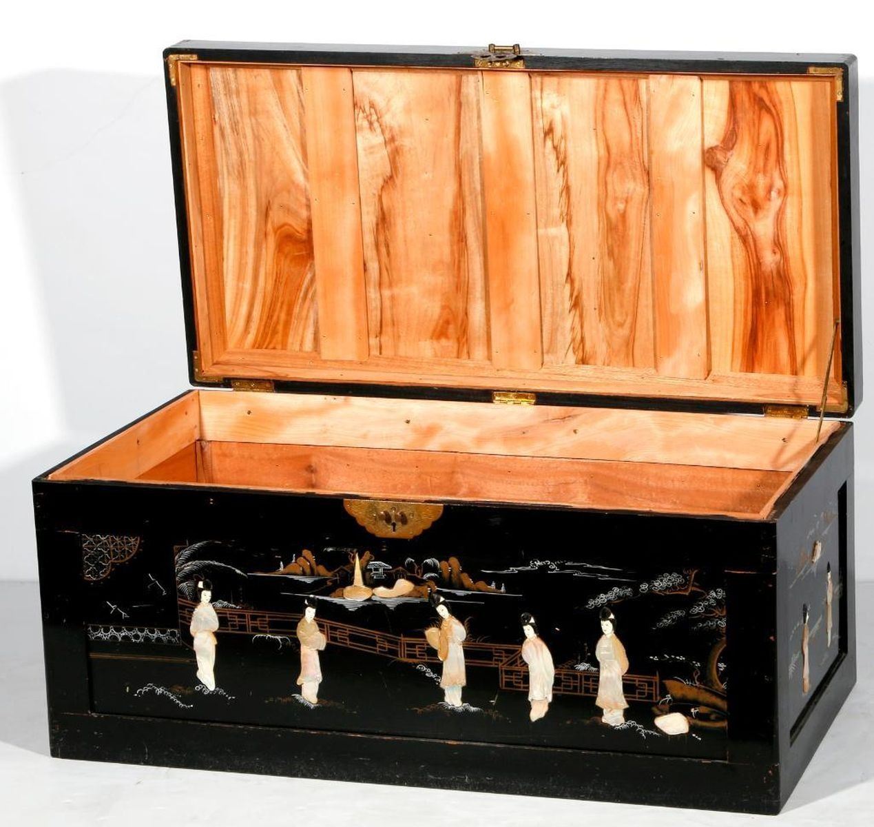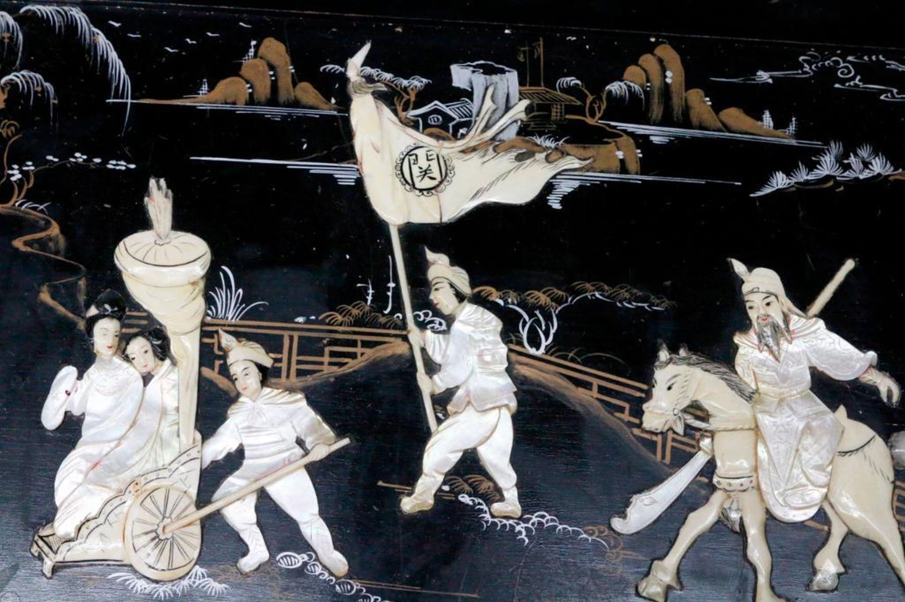 An ebonized and painted Chinese chest with mother of pearl and bone inlays measuring 19 inches high x 40 1/2 wide x 20 deep.