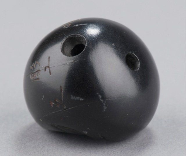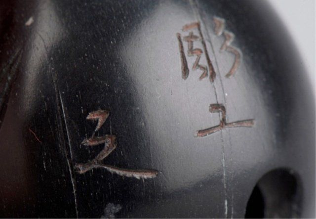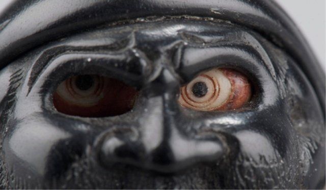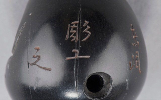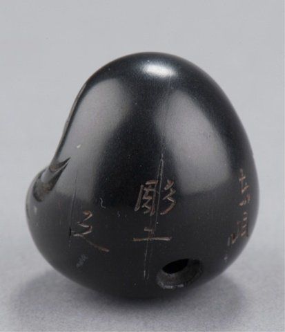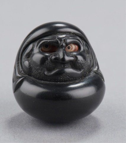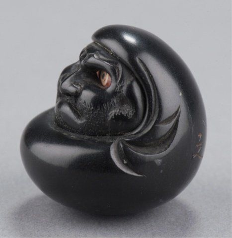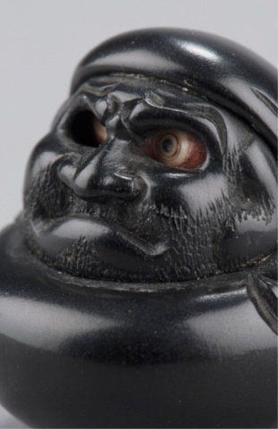 By Tomin, School of Minko, Tsu, Late 18th century. With rolling eyes carved of ivory that has been stained red at the back of the eyeballs and in concentric circles outlining the pupil, which is black. Inscribed & signed on the reverse with the inscription, Tomin kore o chouko (carved by craftsman Tomin).1 1/4in (3.2cm). Provenance: Ex C.V.S. Roosevelt collection, Sotheby's, New York, June 2, 1992; Lot 149
