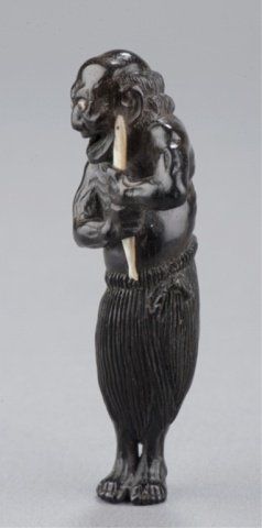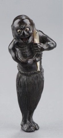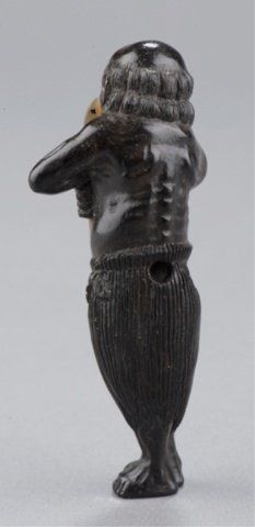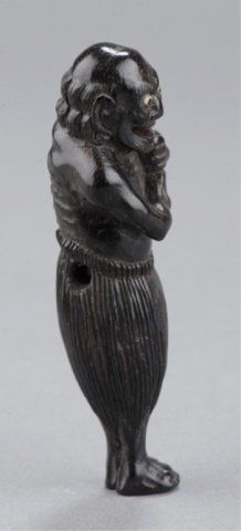 Early 19th century. Standing, wearing a grass skirt, the eyes are inlaid in ivory with horn pupils, in front of him he holds a long mother of pearl fish with both hands. Unsigned. 3 1/8in (8cm).