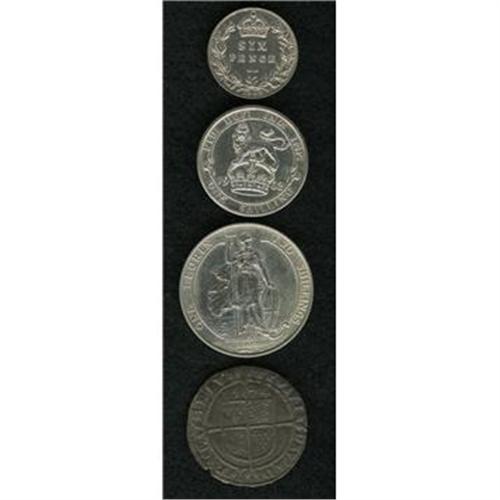 <B>An eclectic group including:</B></I> a matte proof 1902 Sixpence, Shilling and Florin, all lightly hairlined; and an Elizabeth I Sixpence 1574, S-2563 Large Bust, VF details with slightly bent flan and marks on the obverse. <B>A sold as is, no return lot.</B></I>