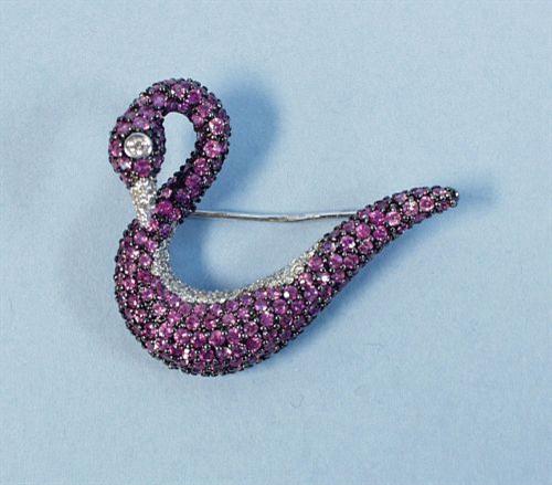 An elegant 18 kt. white gold and diamond swan brooch. Curved body set with a field of pink sapphires accented by white diamonds. Unusual design. Hallmarked and signed.