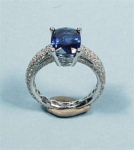 An elegant platinum and diamond ring set with an exceptional natural sapphire, scale weight 4.07 cts. Shank set all around with diamonds, approx. 1.20 cts. Marked. With gemologist's certificate. Circa 1960. 16000-18000