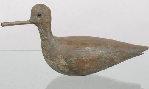 An elegant relic yellowlegs decoy by George Boyd, Seabrook NH. Bill replaced with a dowel, wood missing from the left side near the tail and right side near the wing patch and the eyes are rusted away. Struck by shot. An old veteran. (decoy)