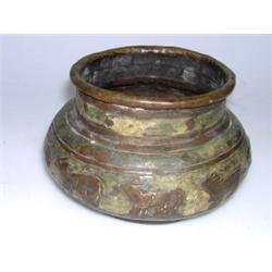 An enamelled brass bowl, possibly Armenian, the short neck and base of the ovolo moulded body with blood red stippling on a mud green ground, a band of sheep between, 11cm diameter £40-60