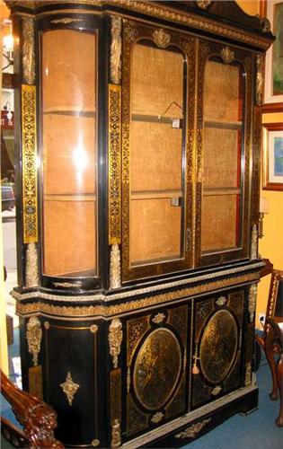 An exceptional 19th century "Boulle" work French gilt bronze mounted ebonized display cabinet. The base is decorated with oval medallions on a black lacquer ground. With unusual gilt bronze mountings. Approx. 60" wide, 76" high. 25000-30000