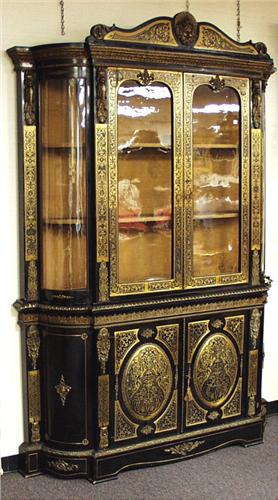 An exceptional 19th century "Boulle" work French gilt bronze mounted ebonized display cabinet. The base is decorated with oval medallions on a black lacquer ground. With unusual gilt bronze mountings. 65" wide, 94" high and 14" deep.