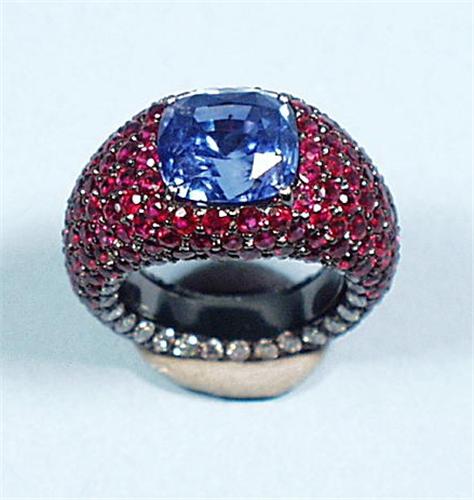 An exceptional Boucheron design ruby encrusted sapphire and diamond ring. Set with a central natural sapphire of 7.28 cts., ruby weight appx. 7.00 cts. Accompanied with Gubelin certificate stating that the sapphire is of a natural colour, without heat enhancement. Fitted with a ring guard.