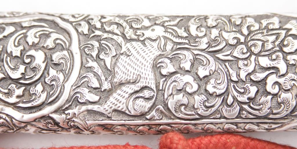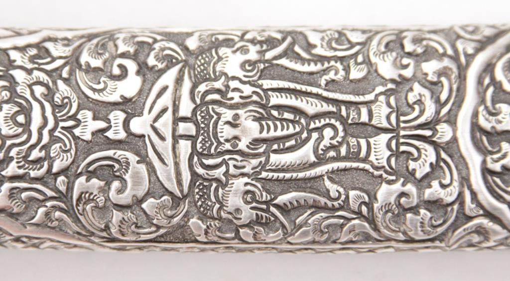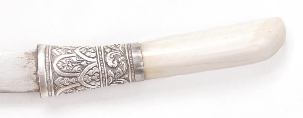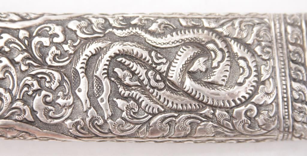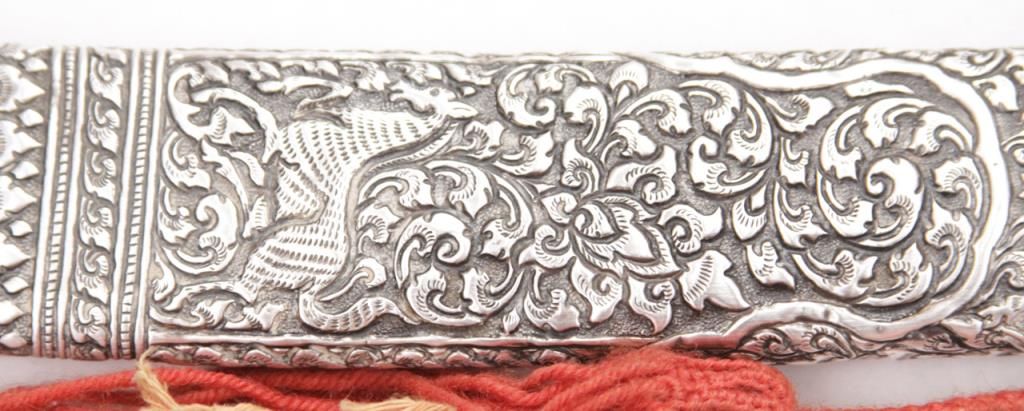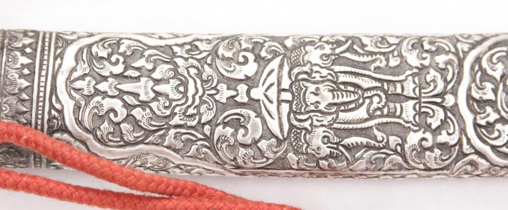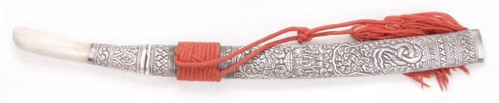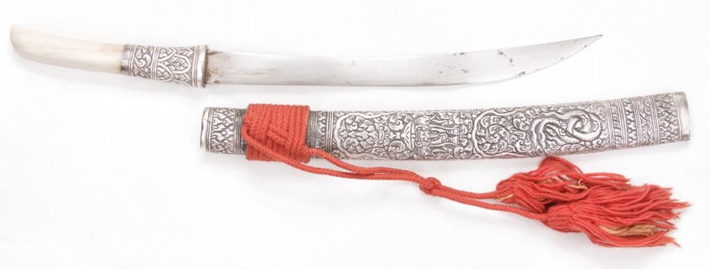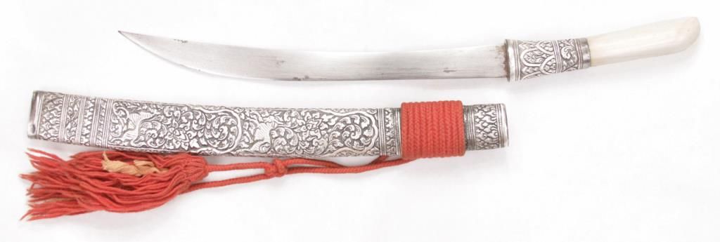 An exceptional Burmese dha with a one piece ivory handle and finely chased and repousse silver scabbard and mounts. Late 19th century. Excellent condition, some minor staining on blade. Measures 21 ½” overall. Est.: $300-$400.