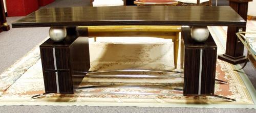 An exceptional French macassar ebony desk with period chrome base and mountings. The top rests on four silvered wood balls. Executed in the taste of Jacques Adnet. Recently restored. 71" long, 27 1/2" wide and 29" high. Circa 1940.
