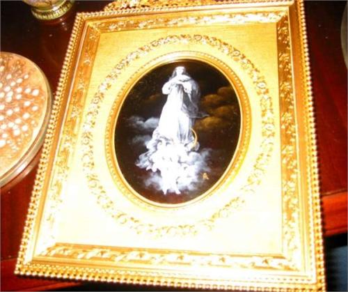 An exceptional antique French Limoges enamel plaque with handpainted symbolist figural subject. In elaborately designed gilt bronze frame. Circa 1860. 3000-3500